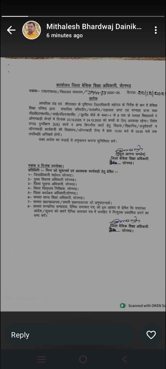 सोनभद्र:- शीतलहर के दृष्टिगत छात्रों के लिए 23 व 24 का अवकाश हुआ घोषित
