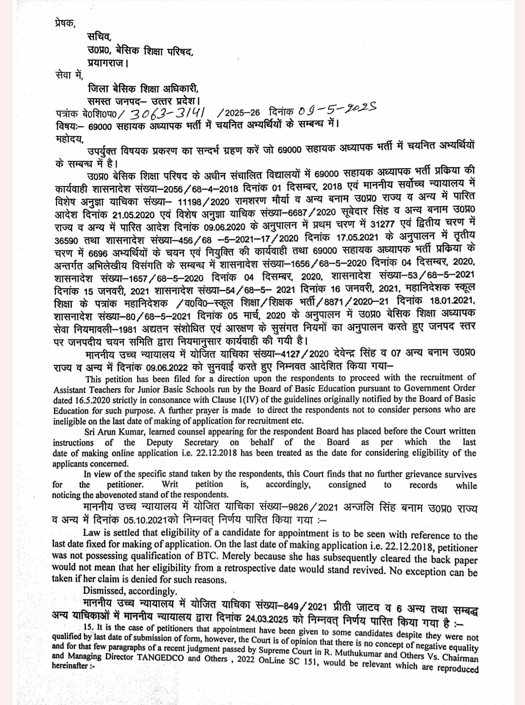 69000 सहायक अध्यापक भर्ती में चयनित अभ्यर्थियों के सम्बन्ध में।