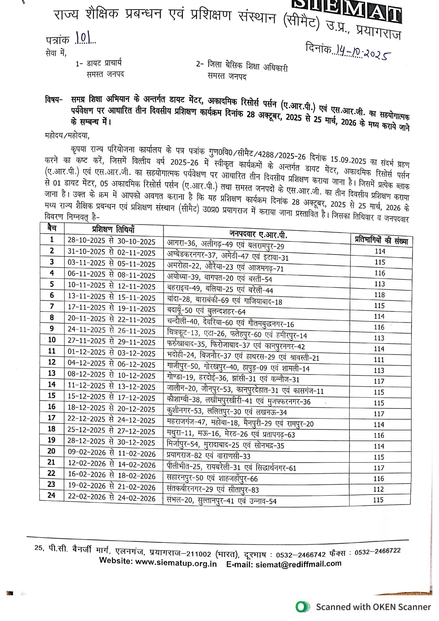 डायट मेंटर, SRG एवं एआरपी का सहयोगात्मक पर्यवेक्षक पर आधारित तीन दिवसीय प्रशिक्षण 28 अक्टूबर 2025 से 25 मार्च 2026 के मध्य कराए जाने के संबंध में
