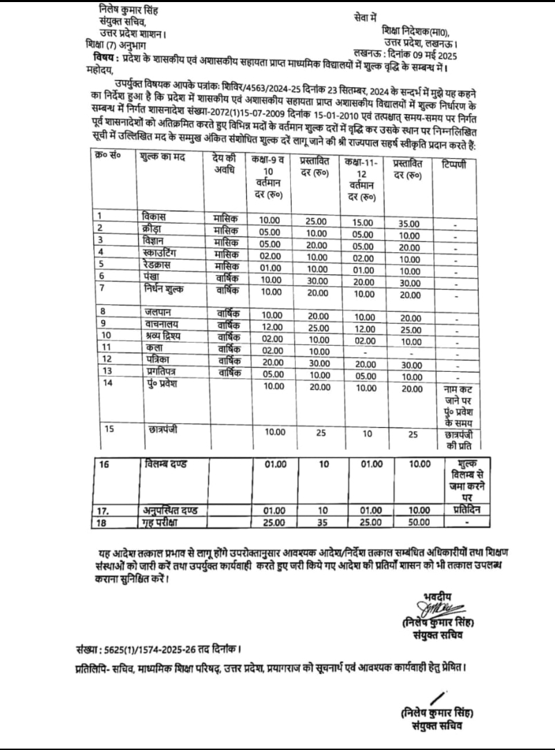 💠यूपी के सभी राजकीय और एडेड माध्यमिक स्कूलों में शुल्क वृद्धि का शासनादेश जारी